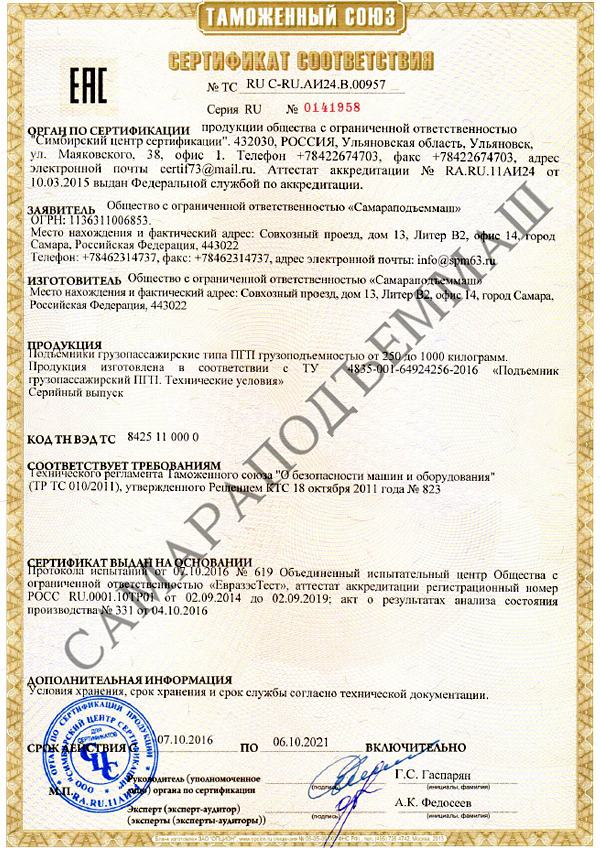 Все подъемники оборудованы системами безопасности. Продукция сертифицирована и прошла испытания, что подтверждается сертификатом соответствия и протоколом испытаний.